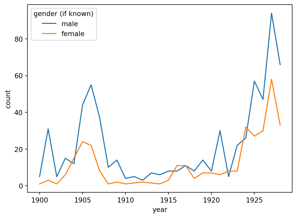 # Group by year, count instances of author by gender