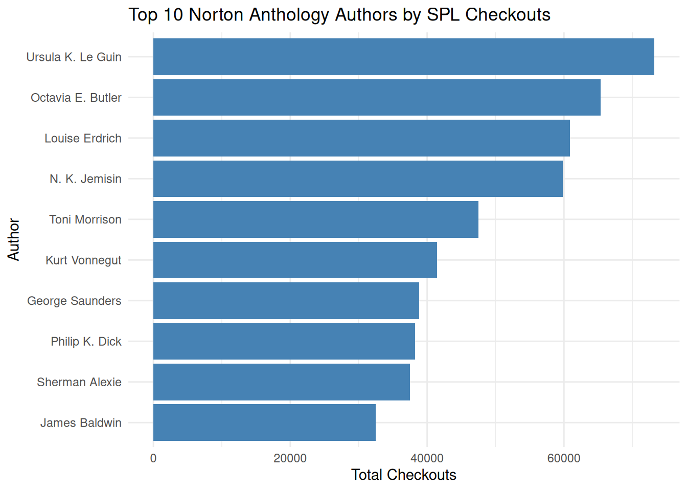 These exercises explore checkout data from the Seattle Public Library for authors in the post-1945 volumes of the Norton Anthology of American Literature, one of the most widely used literary anthologies in U.S. college classrooms. The dataset was compiled as part of the research paper “The Canon in Circulation” (Gupta et al., 2025). The code and data are available on GitHub, and you can explore more of the analysis here. For more context, see the Library Checkouts for the Top 500 “Greatest” Novels data essay.