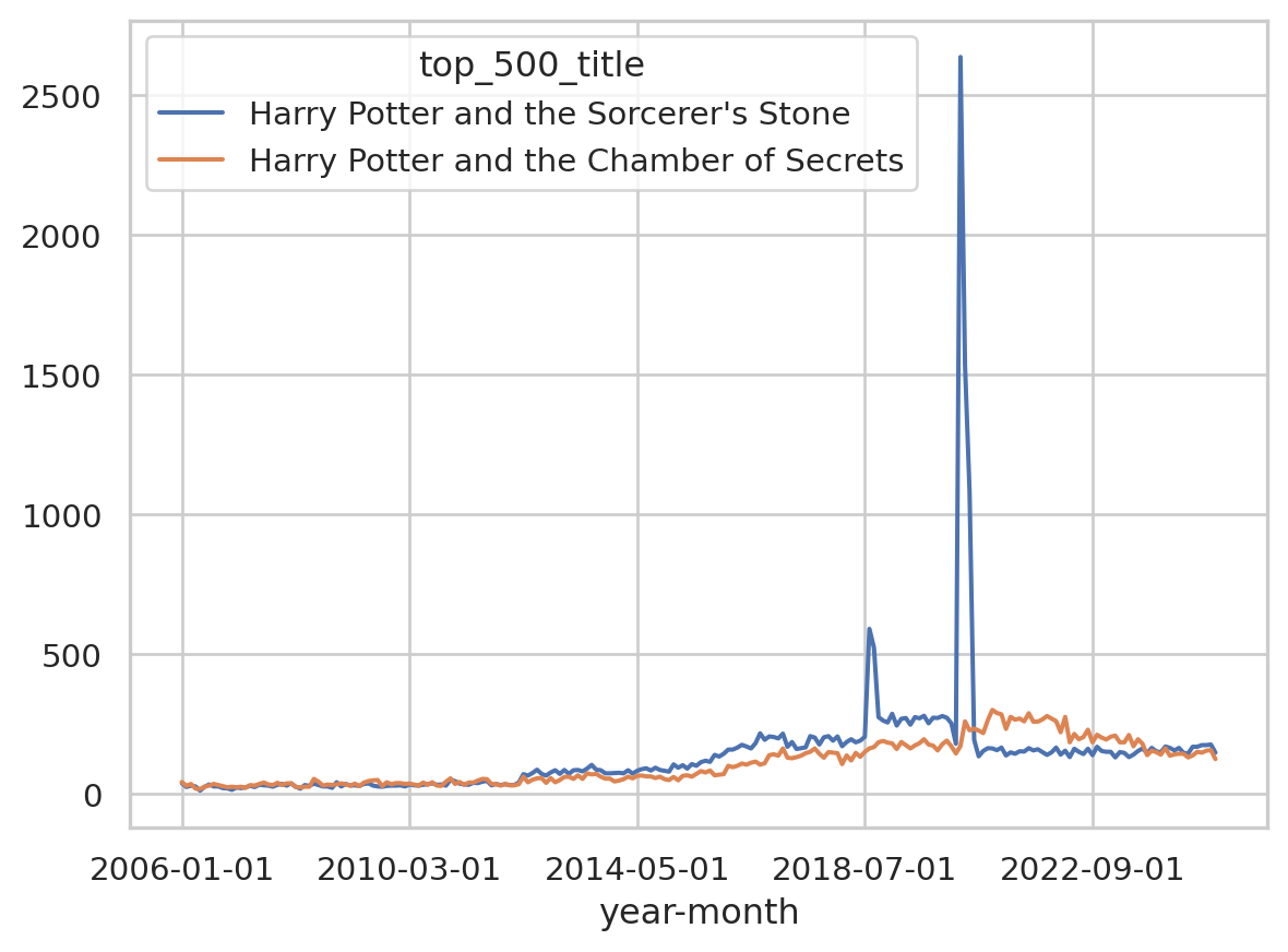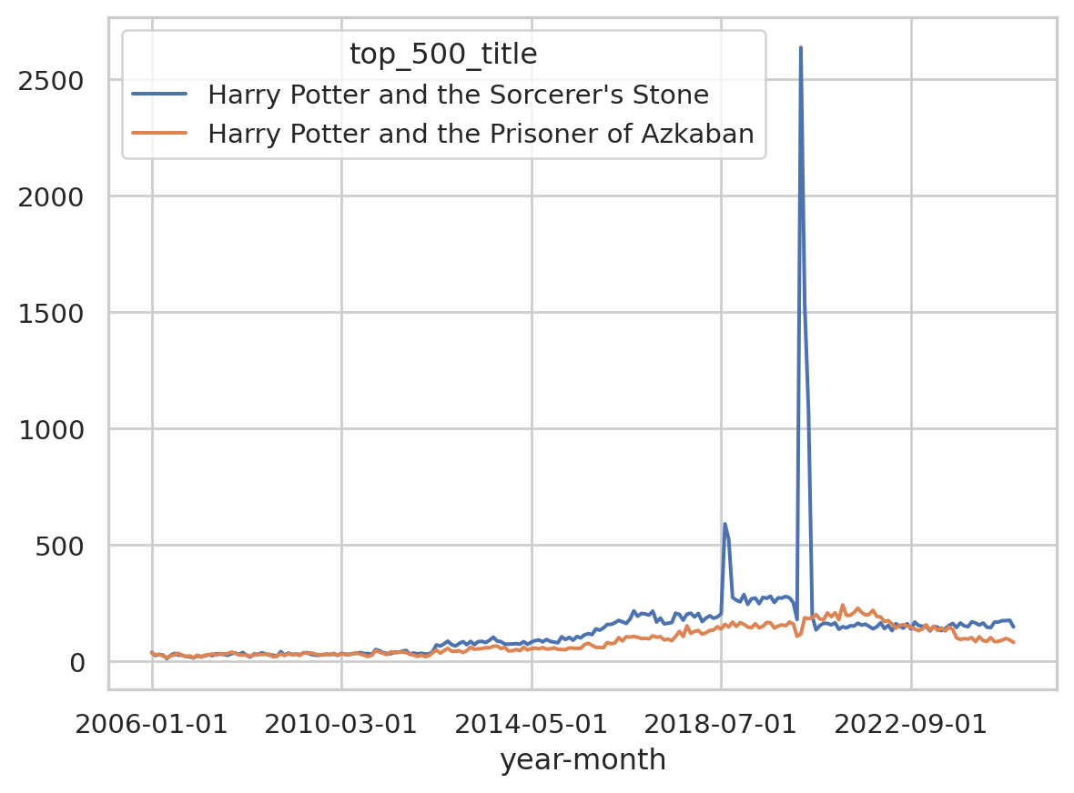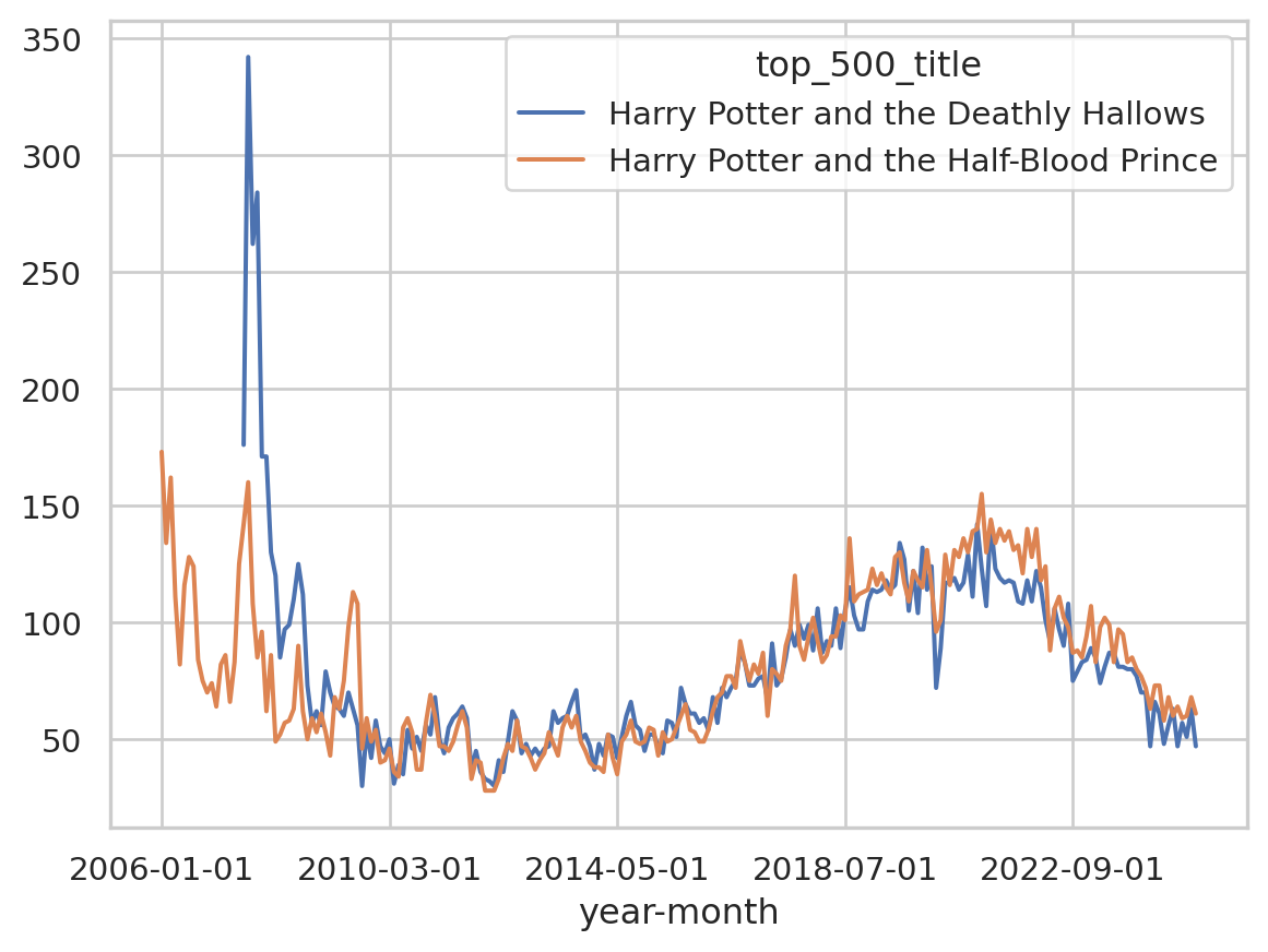 wide_df[["Harry Potter and the Deathly Hallows", "Harry Potter and the Half-Blood Prince"]].plot()