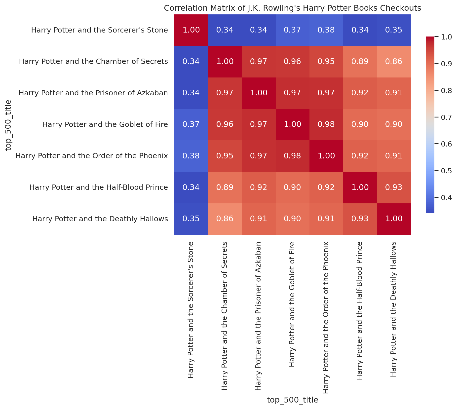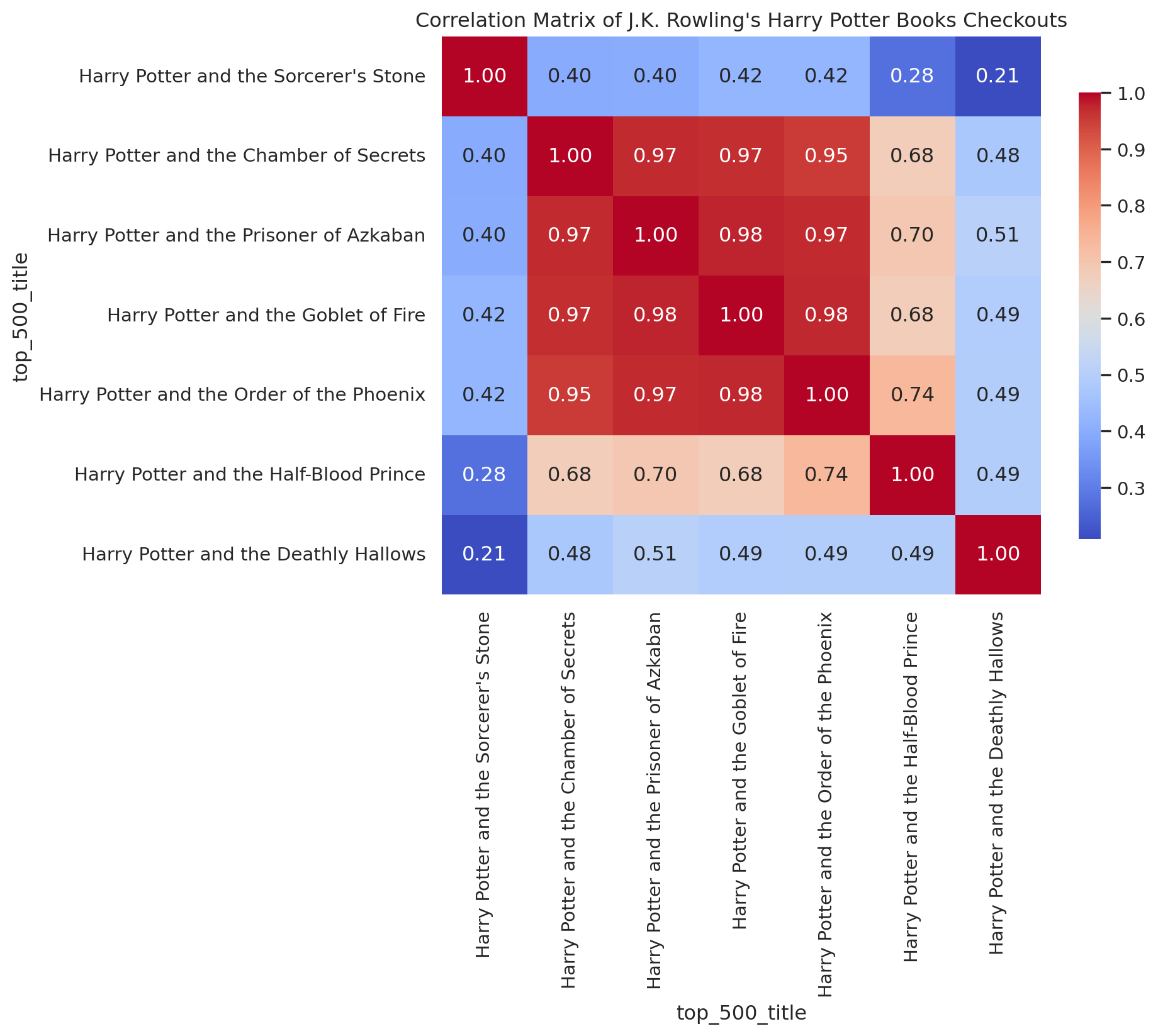 Let’s look at a few specific examples. A lot of books by the same author belong to book series. For example, all of J.K. Rowling’s Harry Potter books are in the top 500 corpus, so we can generate a correlation heatmap for her books.