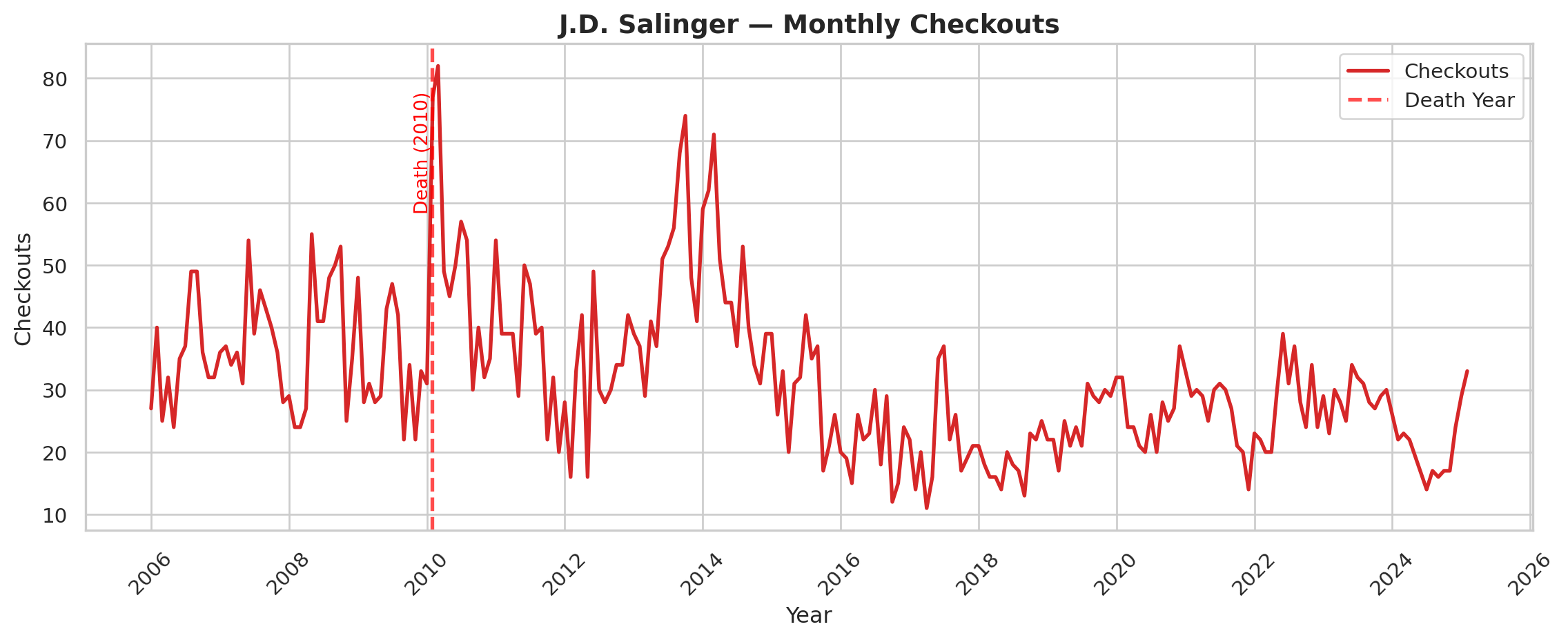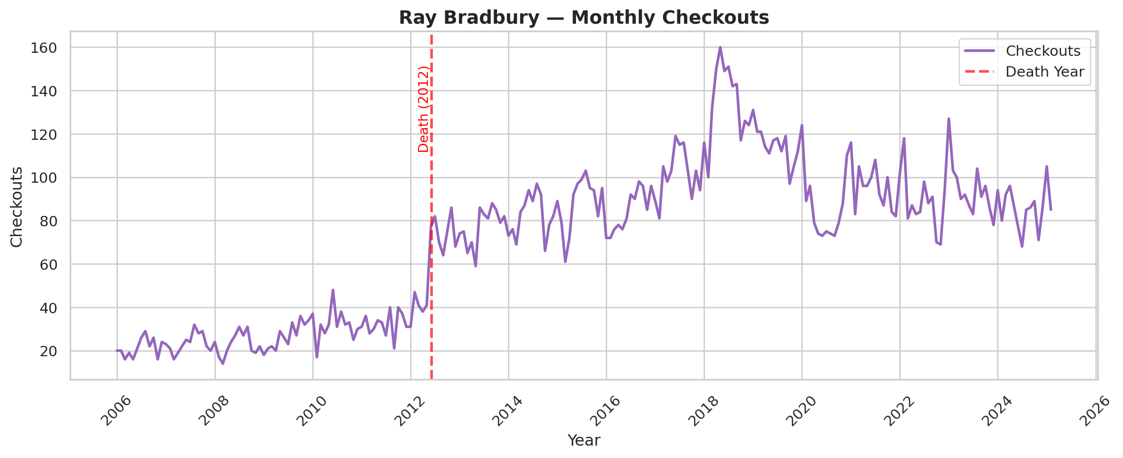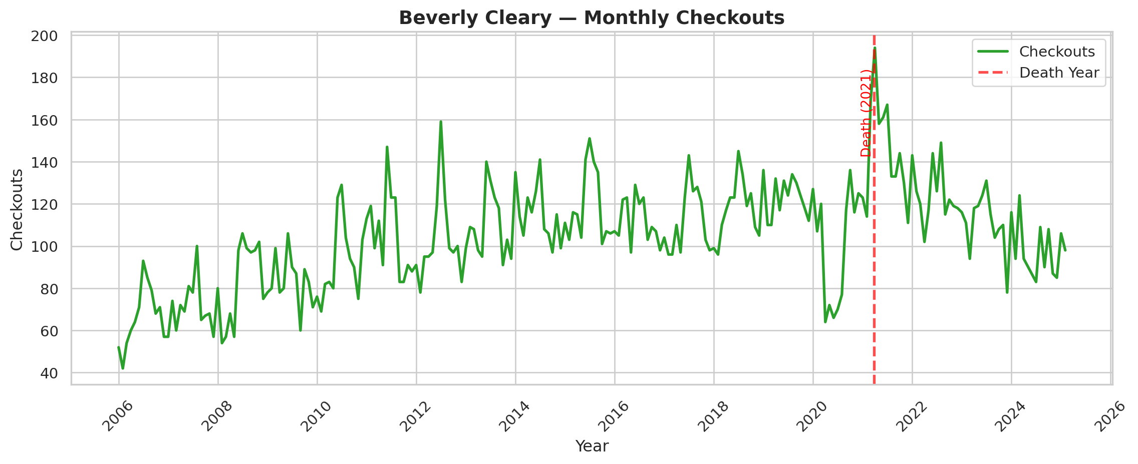 We also don’t know specifically what a library checkout means. What do library checkouts even measure? Does a library checkout indicate a discrete “read” of a book. Do library checkouts correlate with book purchasing behavior form the same region? Do checkouts from the Seattle system indicate national interest from library patrons or just regional interest? These are difficult questions to answer, and we talk more about how we can use library checkouts as proxies for constructs of interest in our original article (Gupta, Christensen, and Walsh 2025).