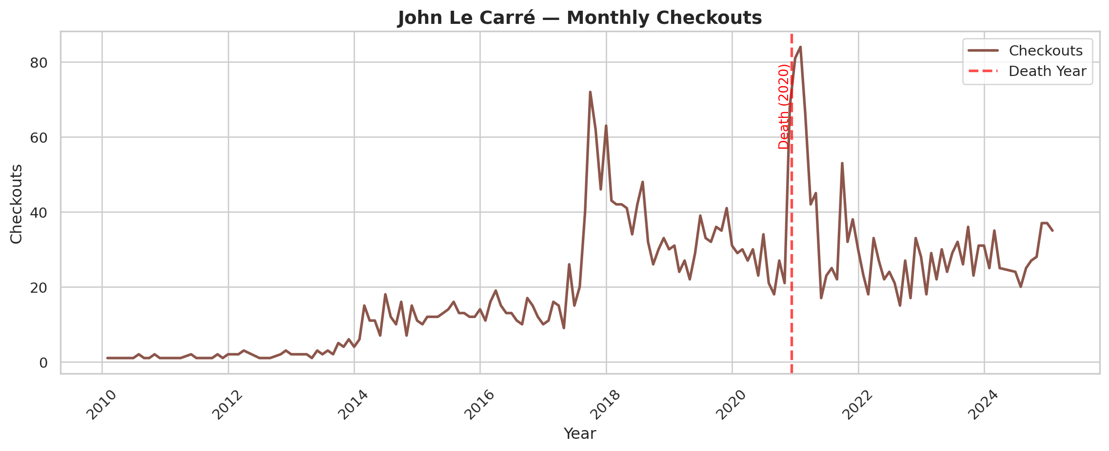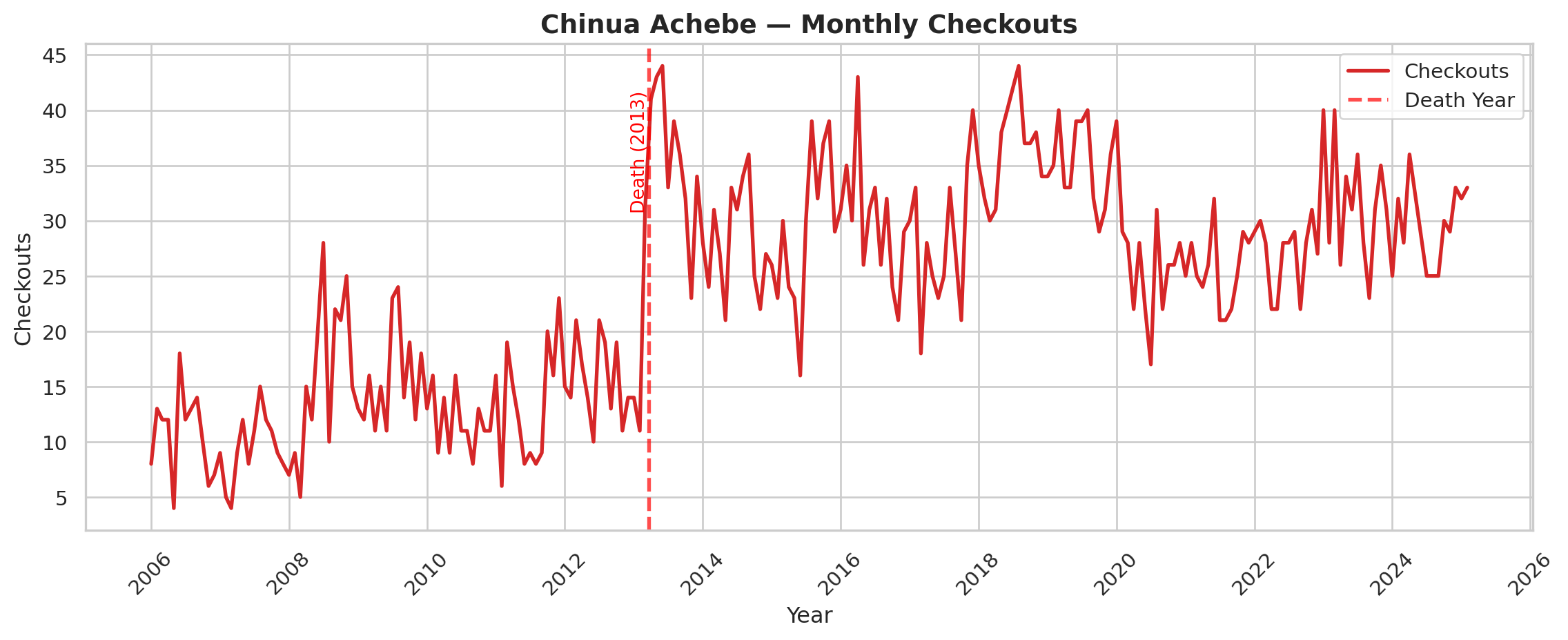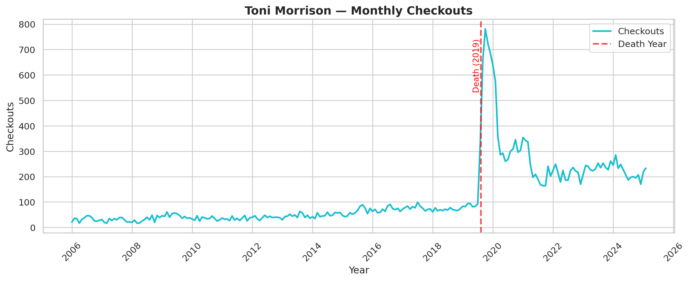 While the SPL uses the data internally to help inform inventory, purchasing behavior, and specific programs, we as researchers are interested in using checkout data to study cultural trends at scale. Thus, the data collected here is a subset of the original SPL open checkout data, and part of an ongoing project to reveal the dynamics of literary popularity through the SPL checkout data. While a powerful resource, the SPL checkout data, like all book data, struggles with persistent book identifiers. The same underlying work can often have different editions, author name variants, and metadata. It is difficult to cluster different versions of the same underlying work together at scale, but we have experimented previously with using a combination of semi-automated methods and manual oversight to cluster smaller sized corpuses of interest (Gupta et al. 2025). The Top 500 Novels Dataset is compelling because it presents a set of works that have persisted in popularity and relevance well past publication date. These are exceptionally popular titles that have avoided the fate of the majority of books, which often fall out of circulation soon after publishing (Cohen 2018) (Sorensen 2007). Studying novels like these is useful to understand how popularity and reception is working for novels that are cultural touchstones.