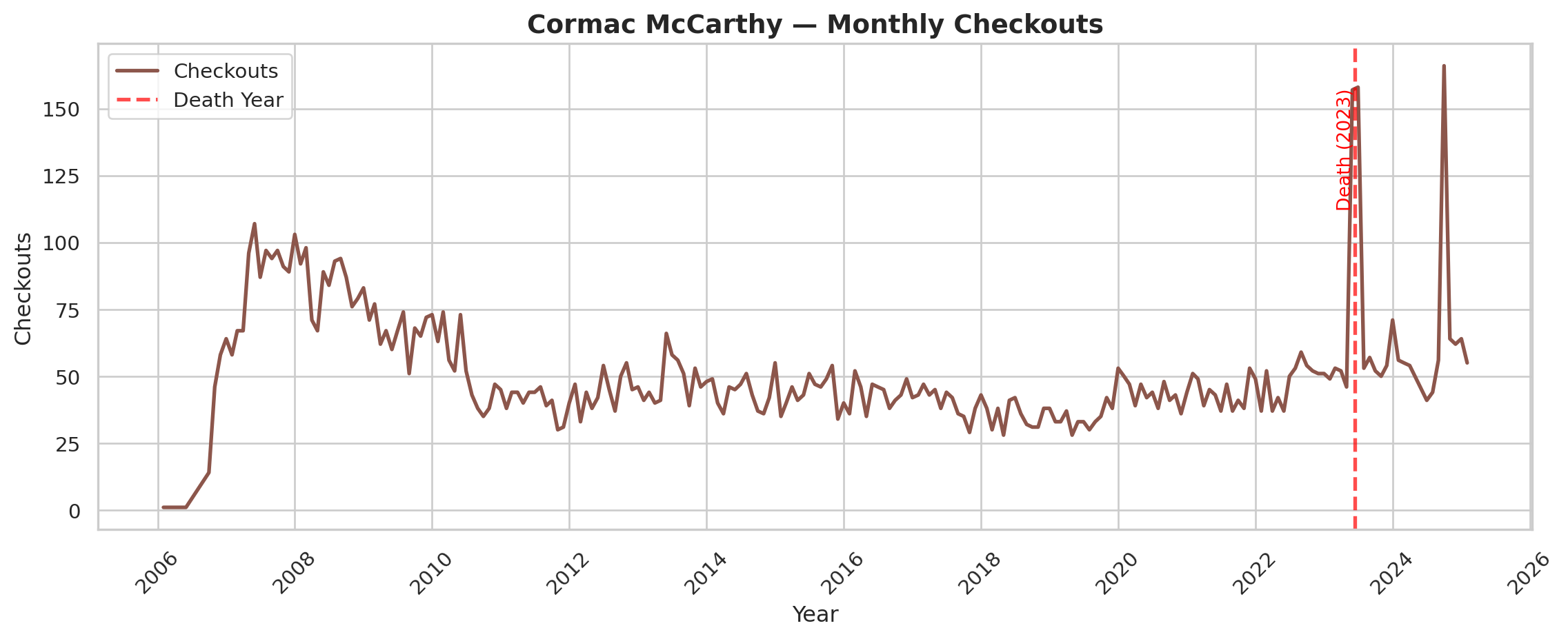 This dataset contains library circulation information for books in the The Top 500 “Greatest” Novels list, the set of novels most widely held in libraries according to OCLC. The Seattle Public Library (SPL) Checkout Data is one of the only publically available sources on circulation and popularity of literary texts (Gupta, Christensen, and Walsh 2025), due to the unavailability of proprietary book sales data (Walsh 2022). The dataset presented here is a combination of both the top 500 “Greatest” novels dataset published on this site, and a mirrored version of the SPL Checkout Data recording checkouts from 2005 up till Feb 2025.