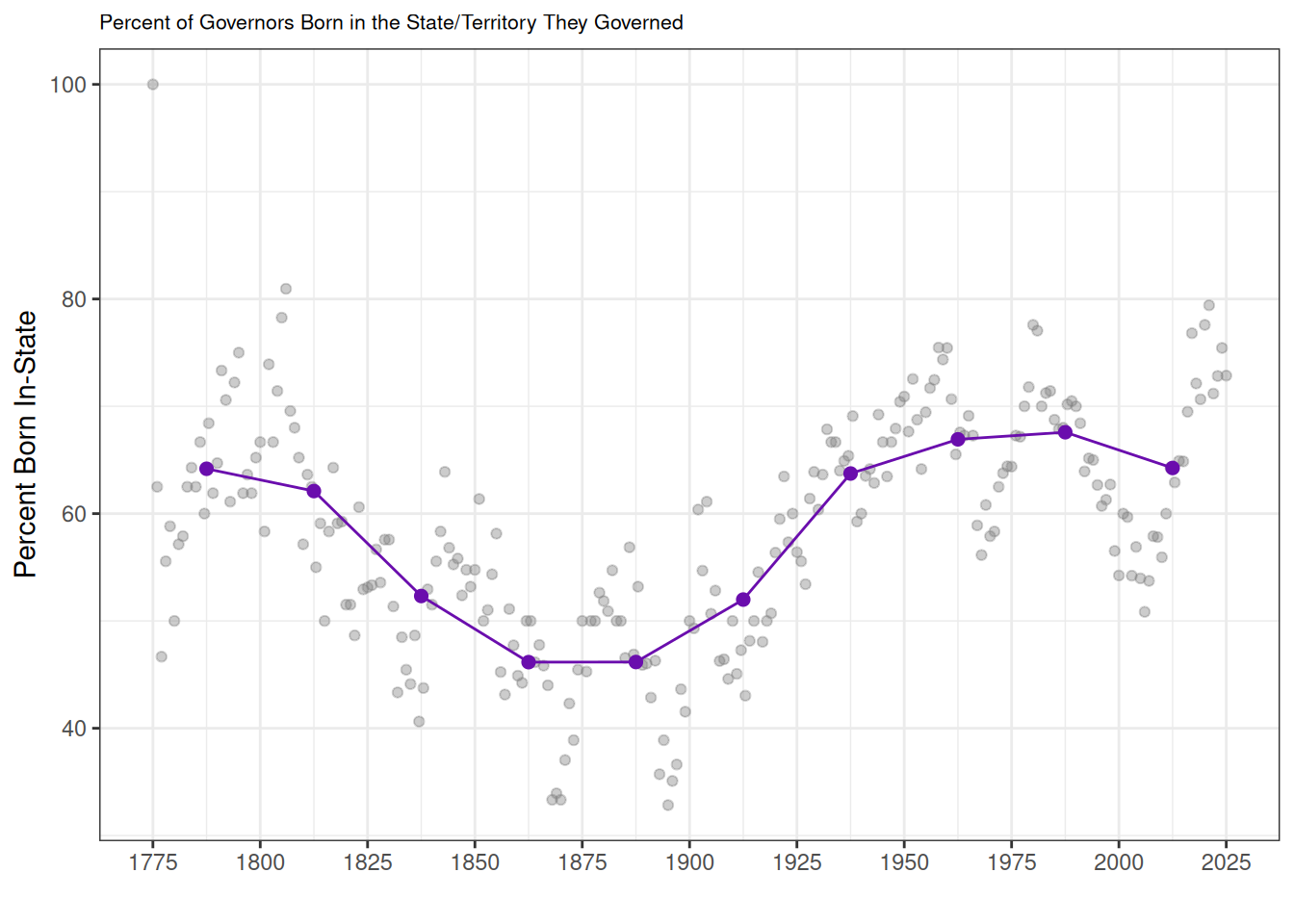 We also want to know if governors were born in the same state that they eventually governed. We plot the share of governors who were born in their state. Surprisingly, this proportion has actually increased over time.