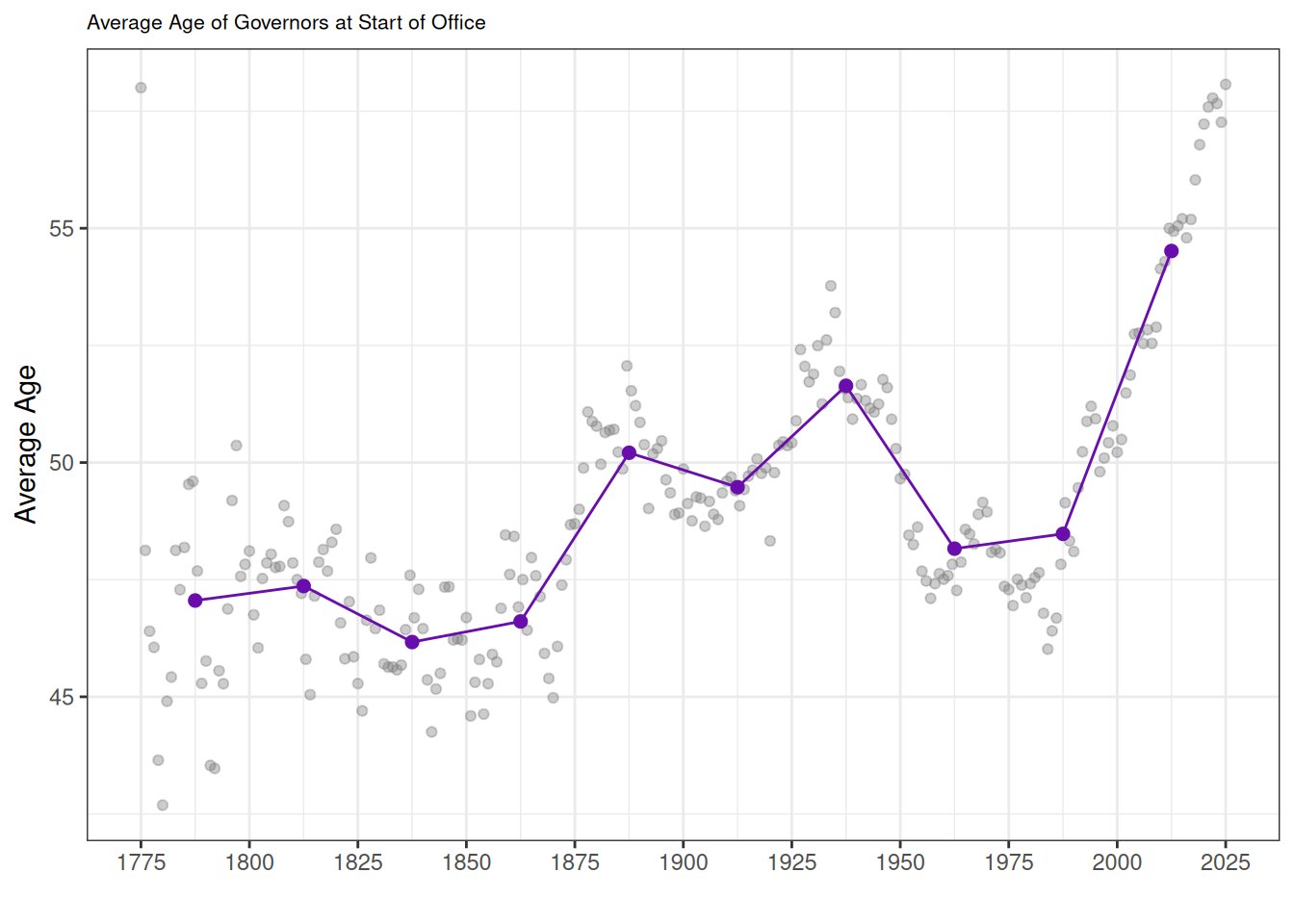 Governors, like many politicians, have been getting older over time. In the past 25 years, the average age at entry has been about 55. This pattern likely reflects not only changes in the typical political career but also broader increases in life expectancy.