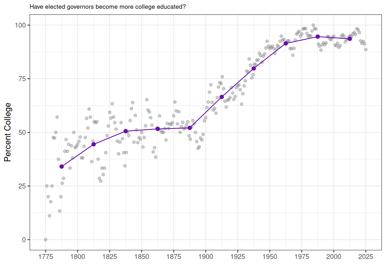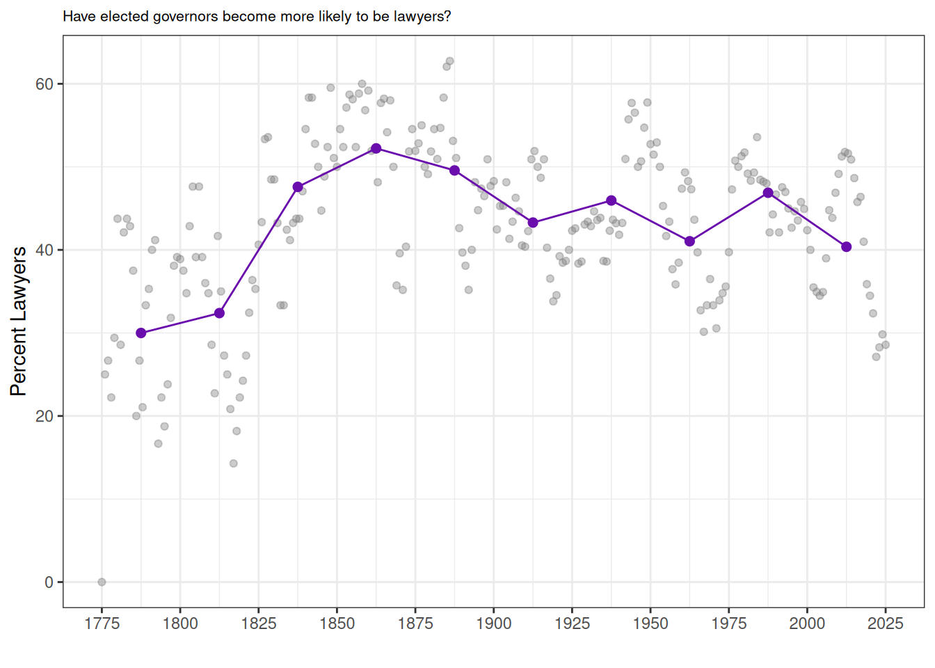 ggtitle("Have elected governors become more likely to be lawyers?") +