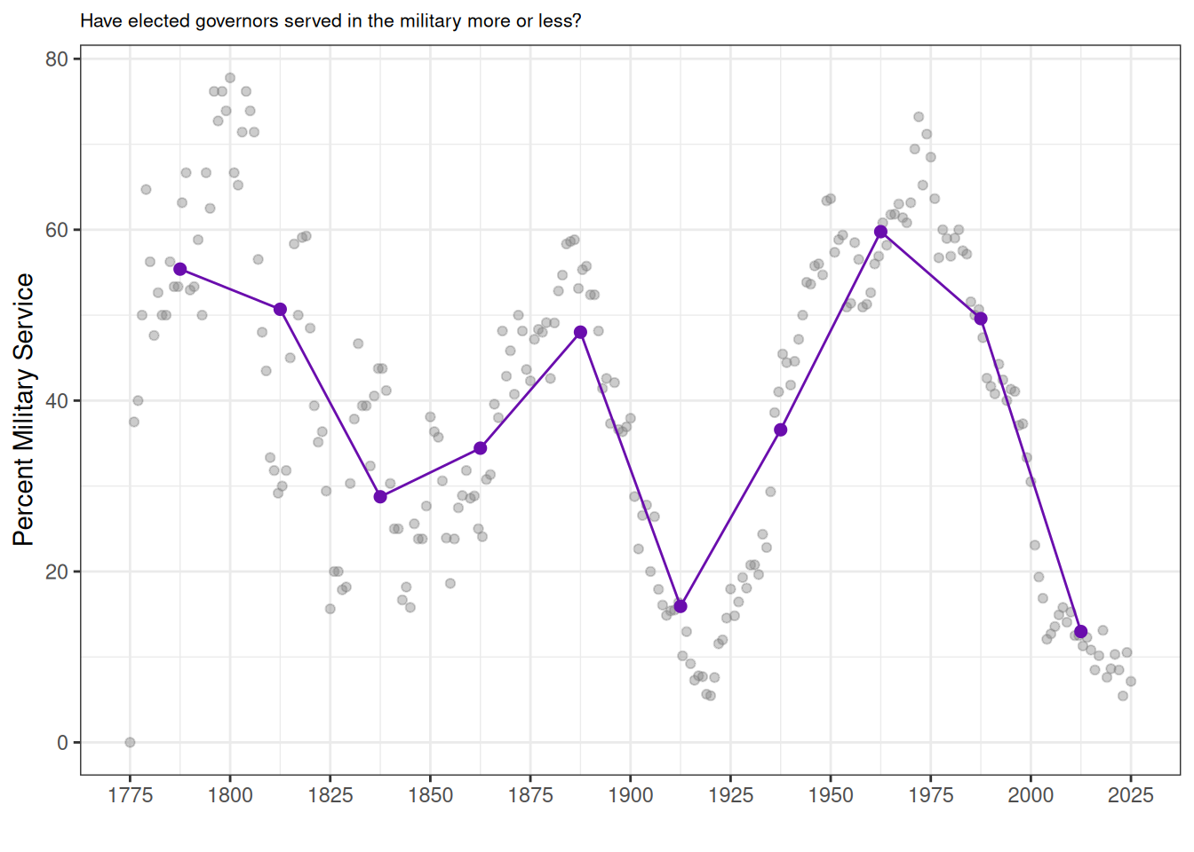 Have gubernatorial offices become more professionalized over the course of American history? We track the share of governors with law degrees as a simple proxy for how “professionalized” the office is. Law has long been a standard path into politics–lawyers gain legal expertise and entry into elite social networks. The share rises through the mid-19th century and then plateaus. Since roughly 2000, it declines modestly, consistent with more governors coming from business and other non-law fields.