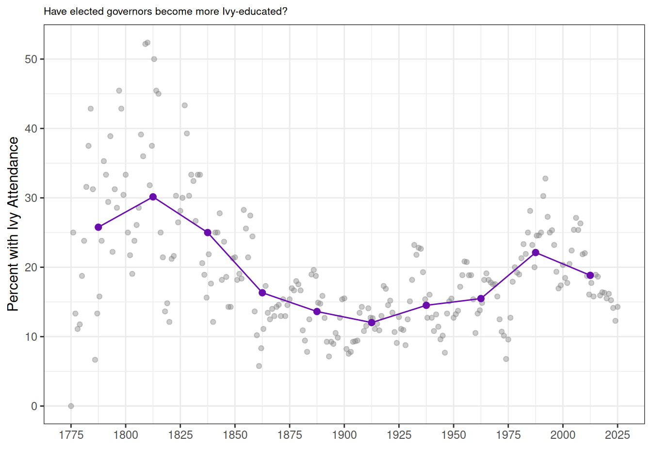 ggtitle("Have elected governors become more Ivy-educated?") +